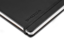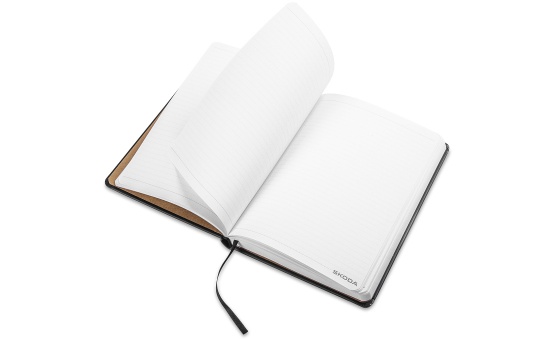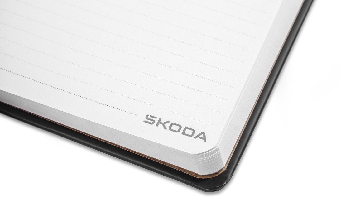 Format A5 zawiera 192 strony w linie z papieru pochodzącego z recyklingu, każda z dyskretnym logo Škoda w prawym dolnym rogu.