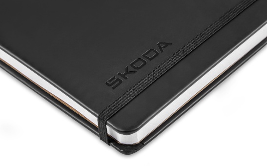Stylowy notes Škoda w eleganckim czarnym kolorze jest idealnym towarzyszem do zapisywania notatek, pomysłów i codziennego planowania.