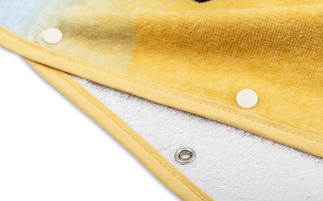 Chłopięcy ręcznik z kapturem i motywem uroczego misia w mgnieniu oka zamienia się w praktyczne ponczo – wystarczy zapiąć metalowe napy po bokach, a ręcznik pozostanie na ramionach, nie ograniczając ruchów.