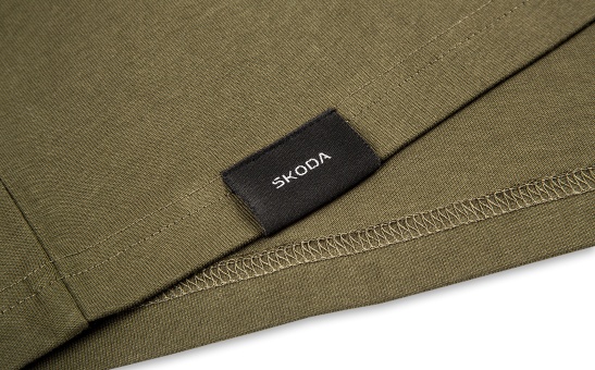 Subtelna, czarna, tkana metka z logo Škoda na dolnej krawędzi koszulki.